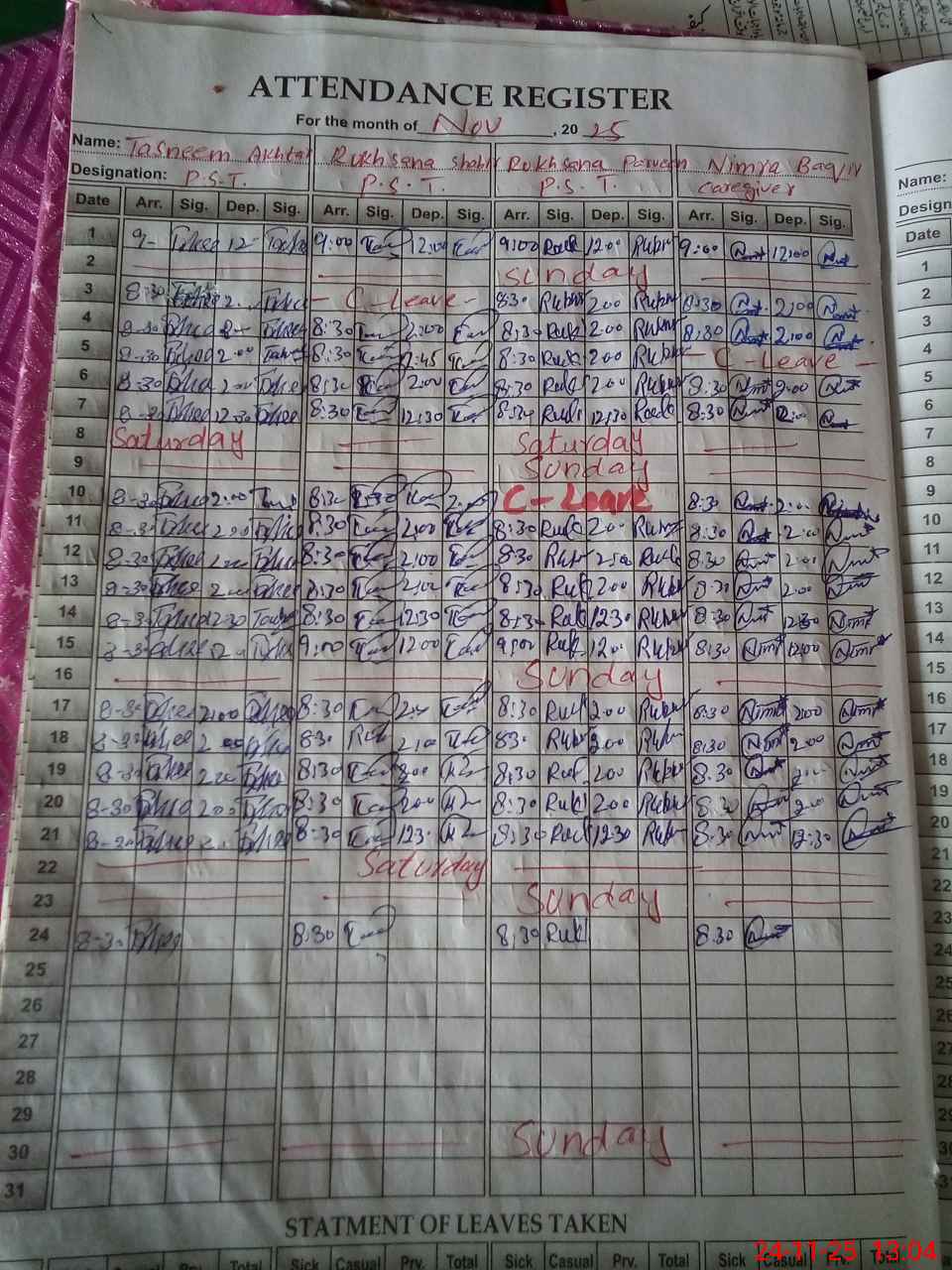 | Leave | Duty | Absent | Maternity | Medical | Ex- Pak |