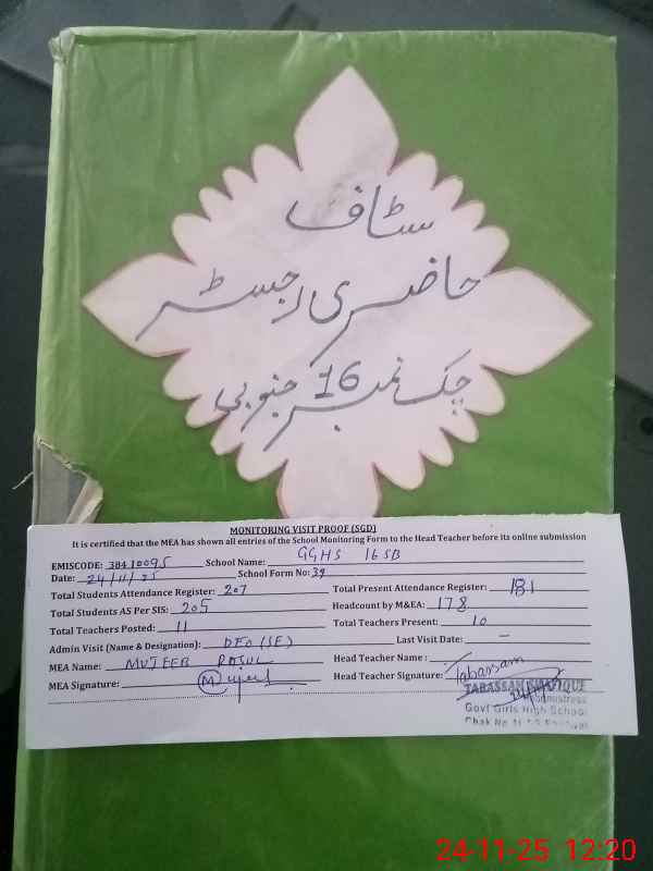 | EMIS Code: 38410095 | Name of School: GGHS CHAK NO.16 SB | |||