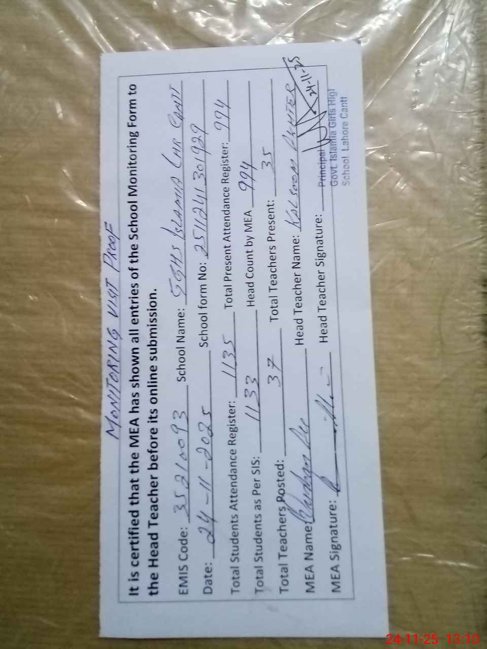 | Attendance Register | Head Teacher | MEA with School | Visit Proof |