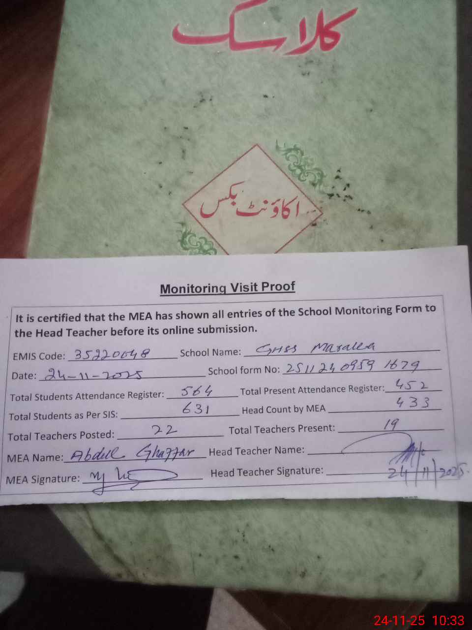 | Attendance Register | Head Teacher | MEA with School | Visit Proof |