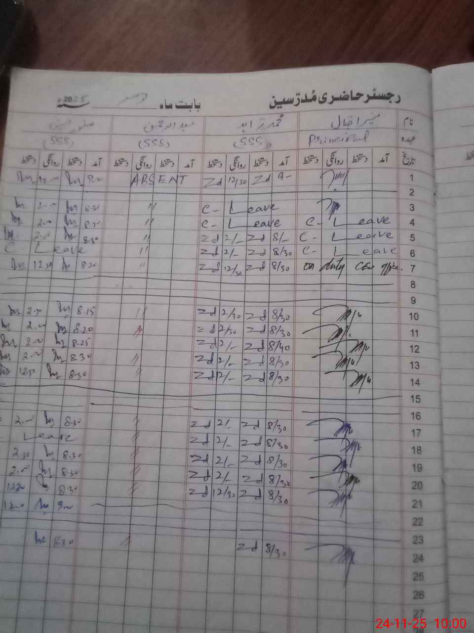 | CNIC | Full Name | Designation | R/C | Absence during last cal. month |