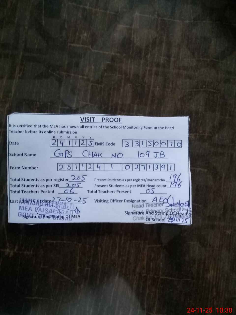 | Attendance Register | Head Teacher | MEA with School | Visit Proof |
