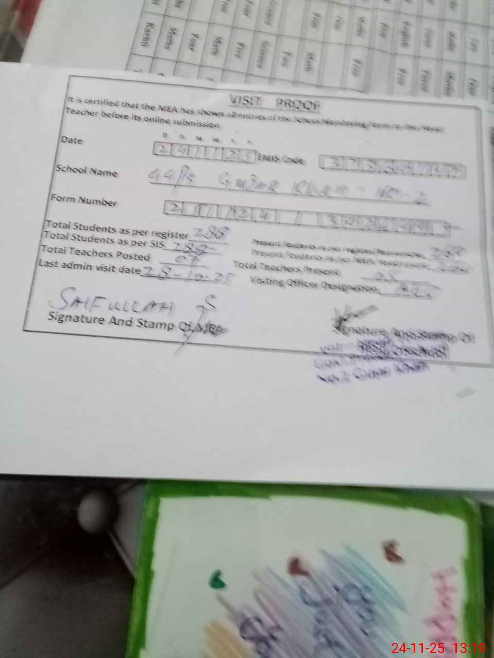 | Attendance Register | Head Teacher | MEA with School | Visit Proof |