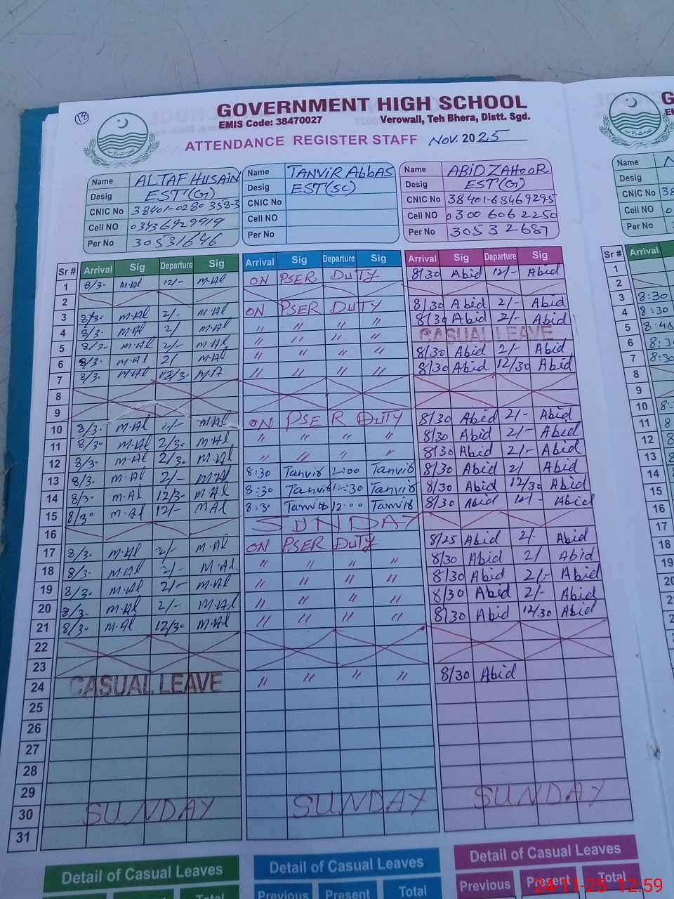 | CNIC | Full Name | Designation | R/C | Absence during last cal. month |