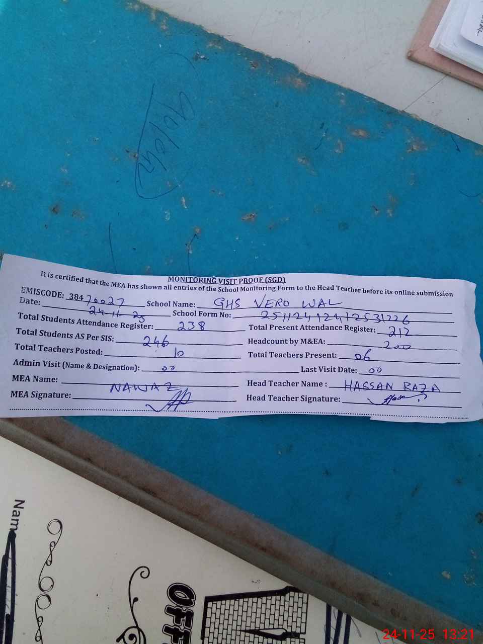| Attendance Register | Head Teacher | MEA with School | Visit Proof |