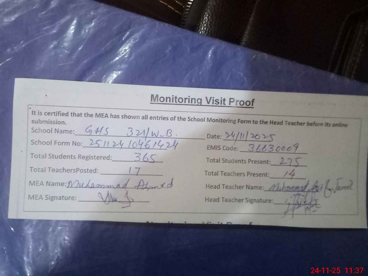 | Attendance Register | Head Teacher | MEA with School | Visit Proof |