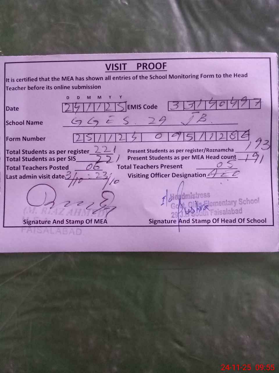 | Attendance Register | Head Teacher | MEA with School | Visit Proof |