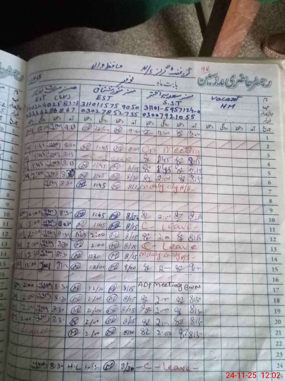 | CNIC | Full Name | Designation | R/C | Absence During Last Calender Month |