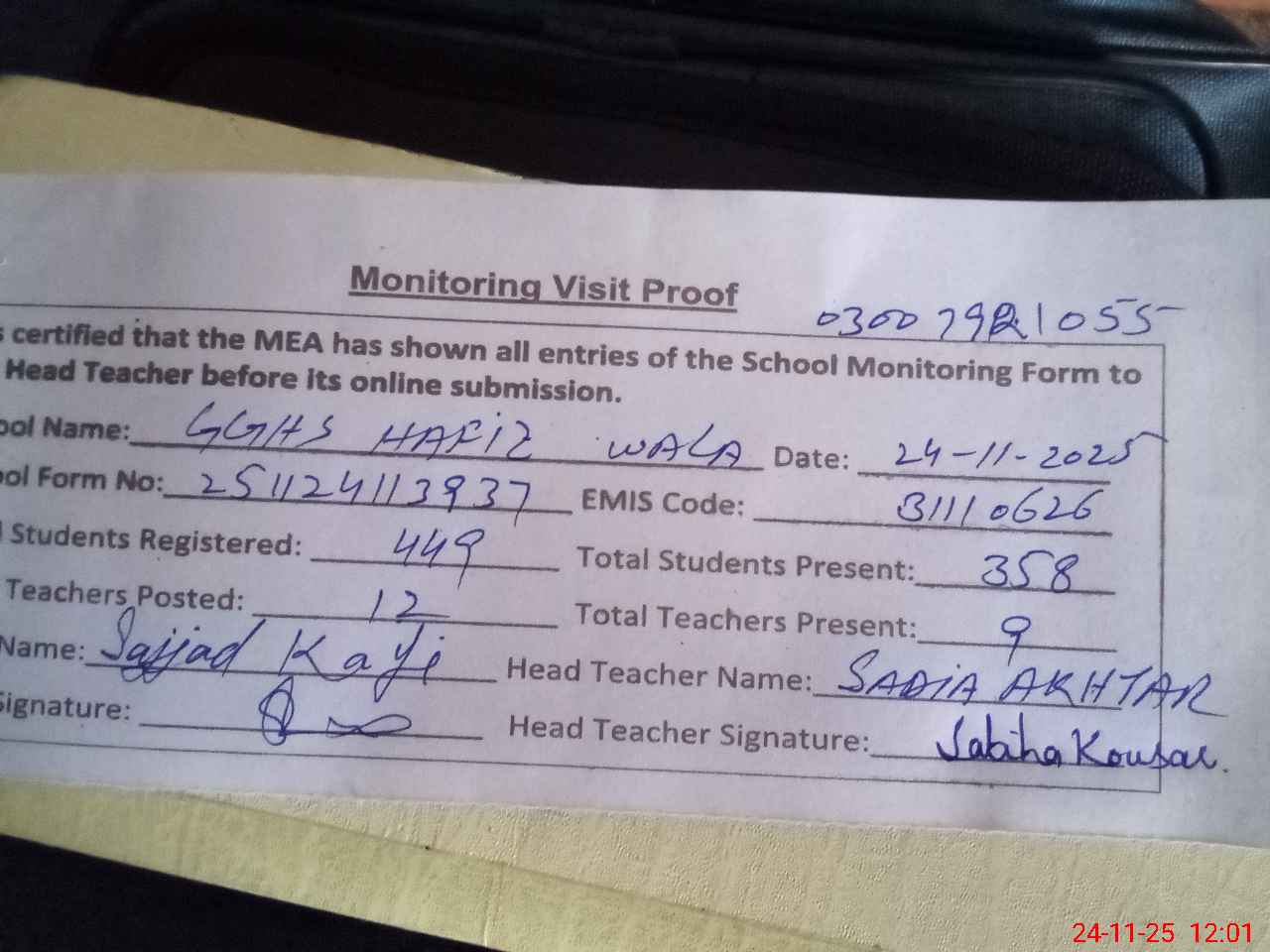 | Attendance Register | Head Teacher | MEA with School | Visit Proof |