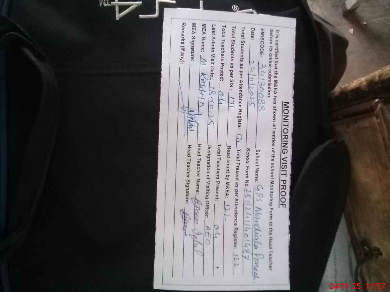 | Attendance Register | Head Teacher | MEA with School | Visit Proof |