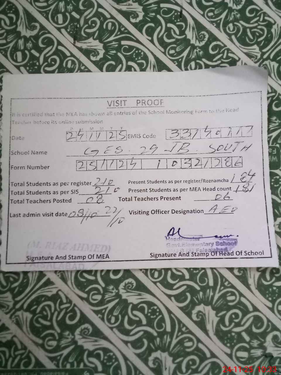 | EMIS Code: 33140117 | Name of School: GES CHAK 29 JB SOUTH | |||