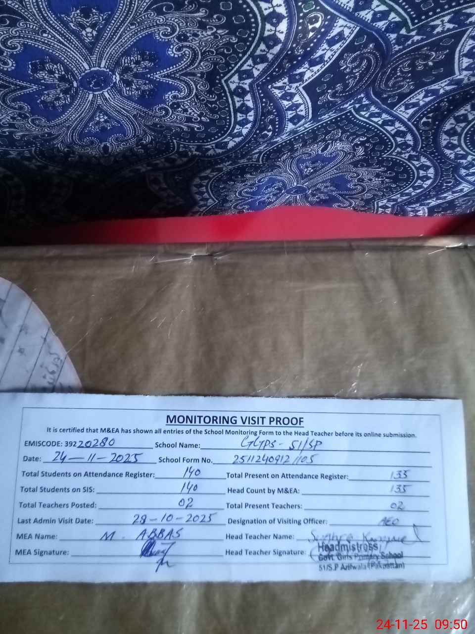 | Attendance Register | Head Teacher | MEA with School | Visit Proof |