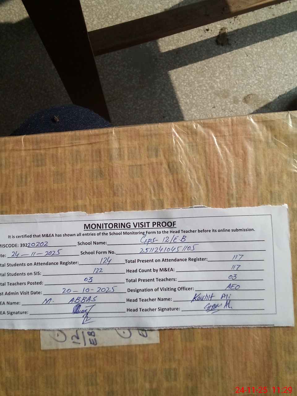 | Attendance Register | Head Teacher | MEA with School | Visit Proof |