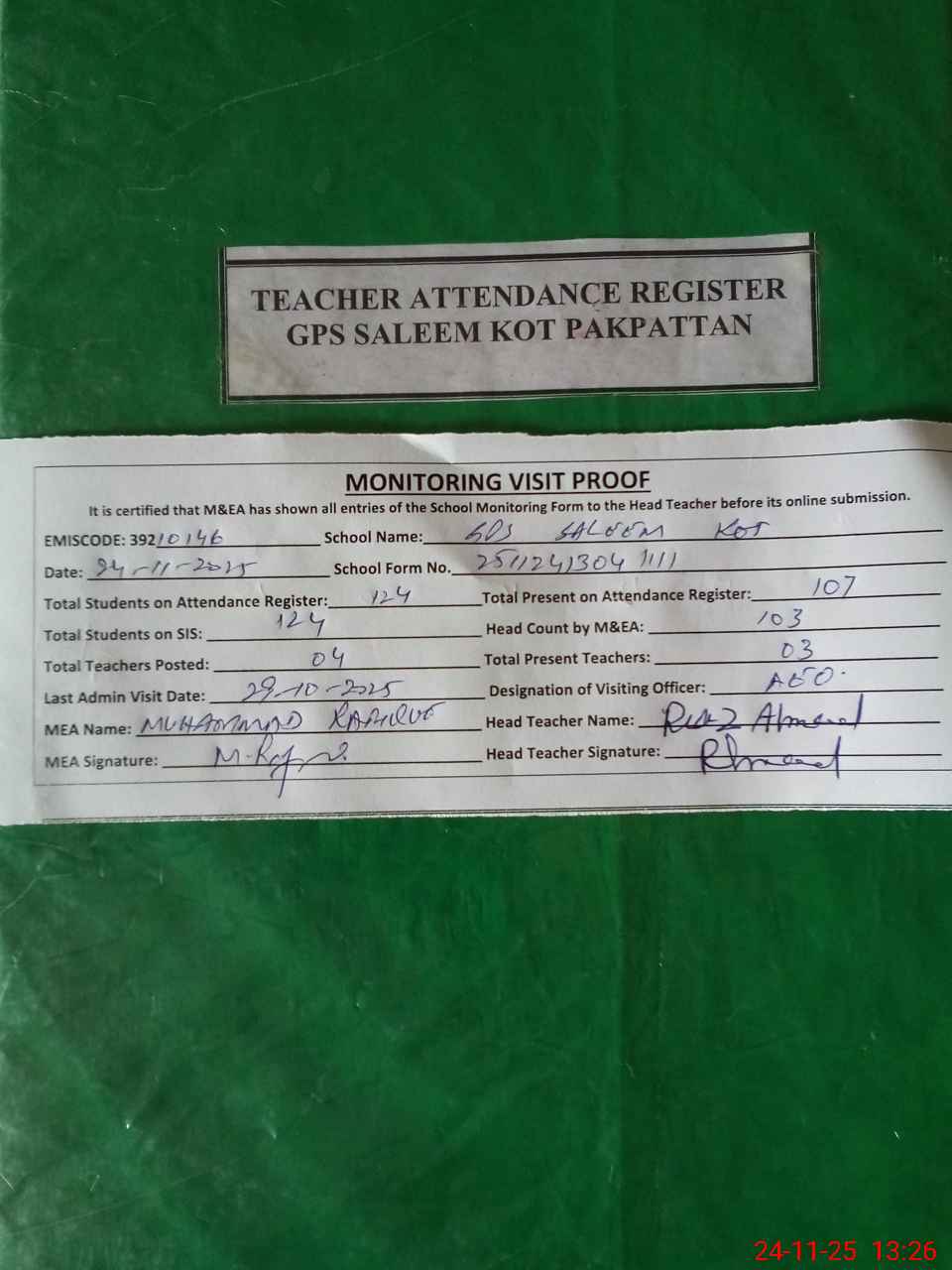 | Attendance Register | Head Teacher | MEA with School | Visit Proof |