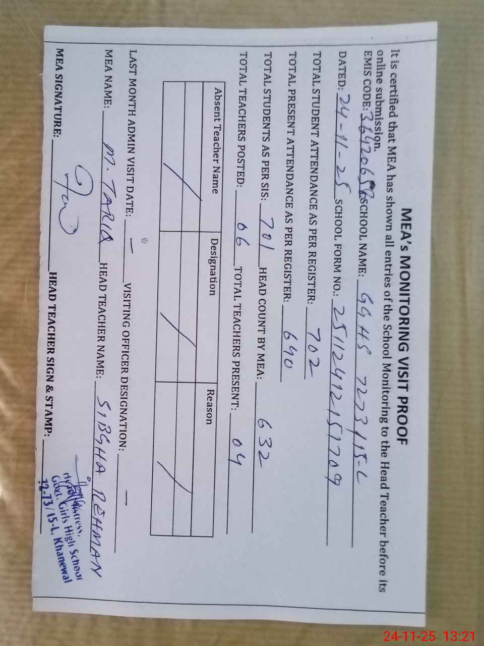 | Attendance Register | Head Teacher | MEA with School | Visit Proof |