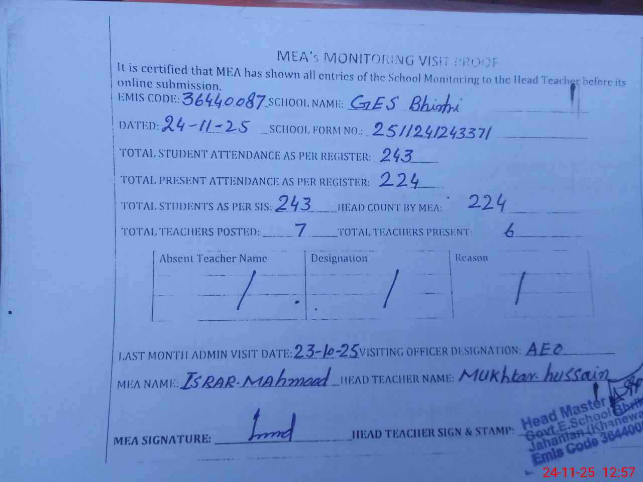 | Attendance Register | Head Teacher | MEA with School | Visit Proof |