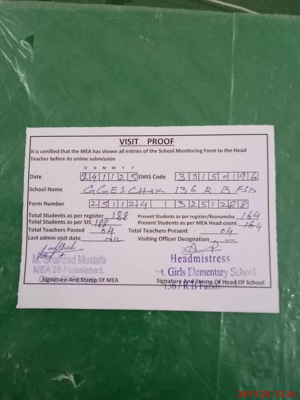 | Attendance Register | Head Teacher | MEA with School | Visit Proof |