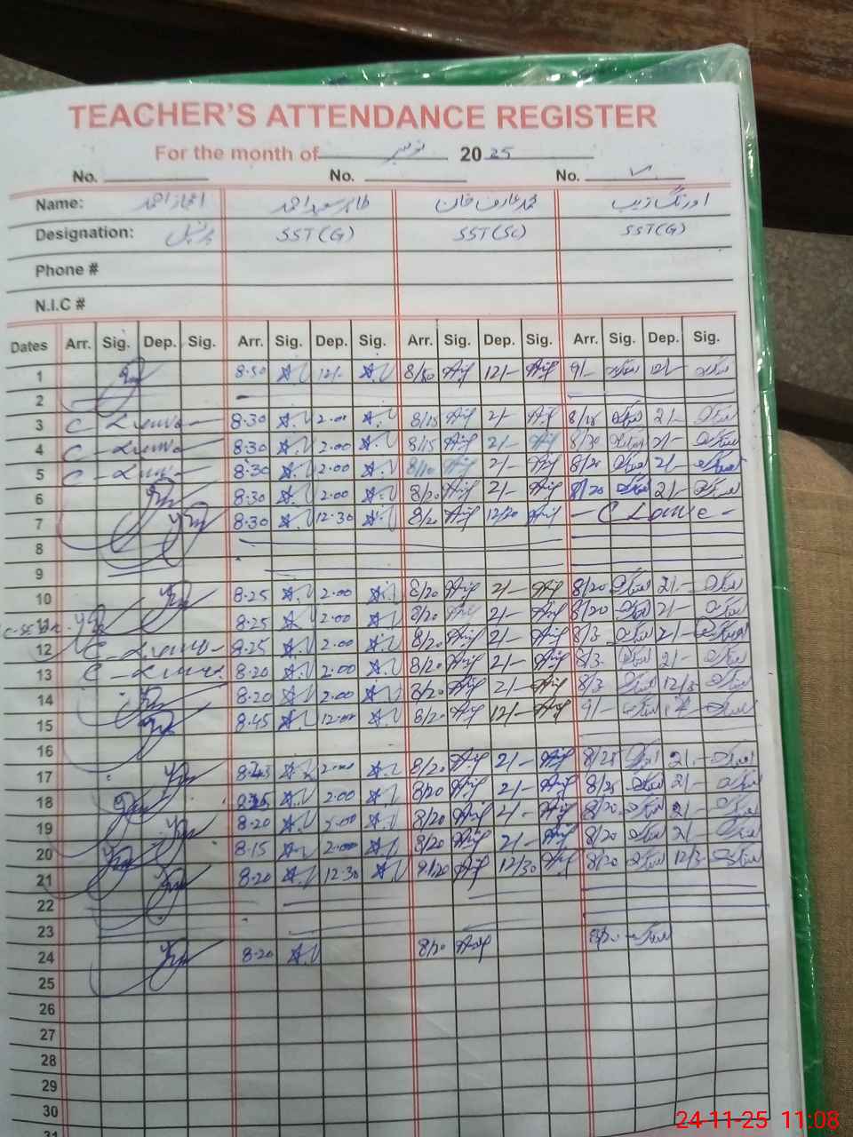 | CNIC | Full Name | Designation | R/C | Absence during last cal. month |