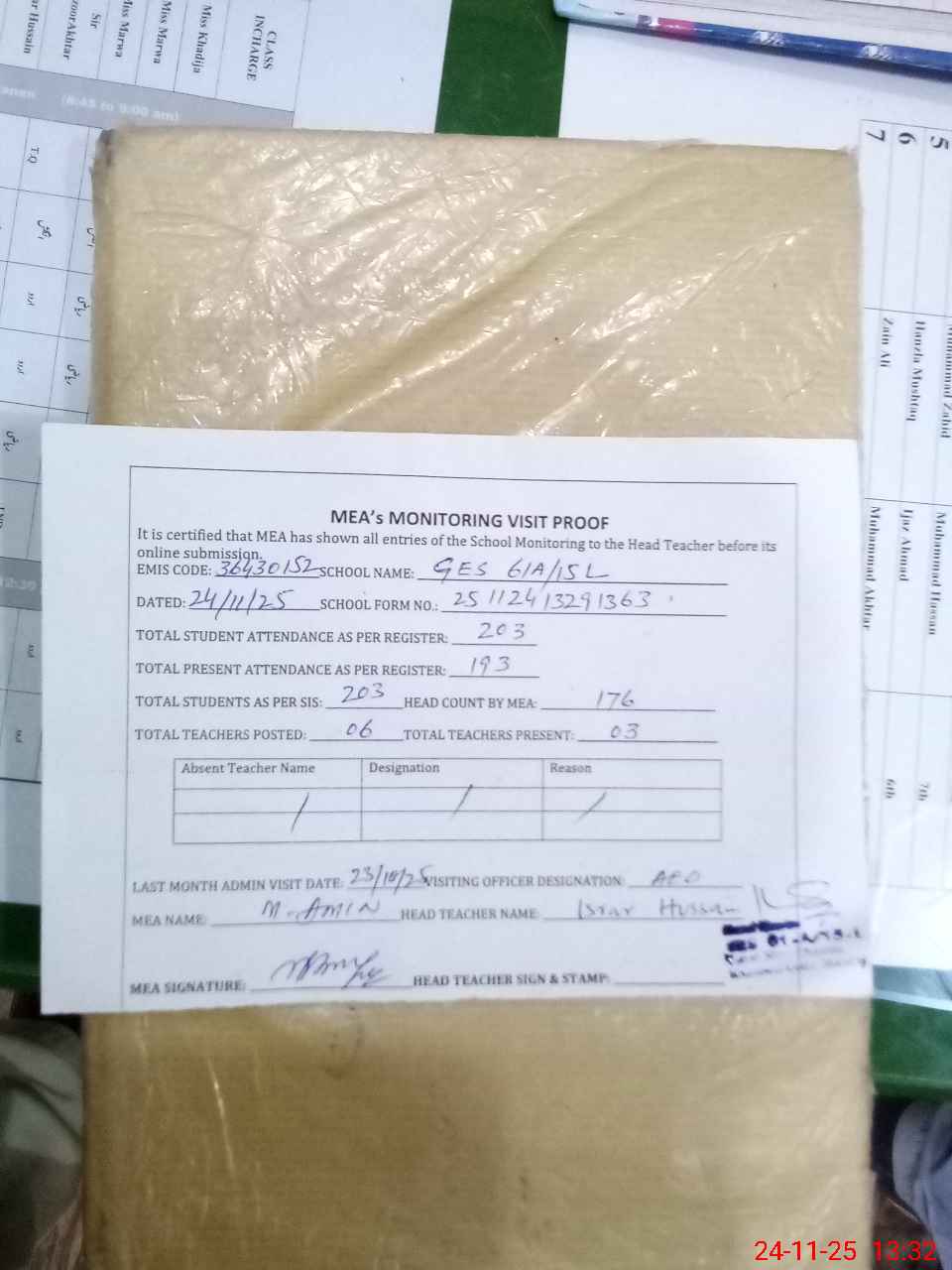 | Attendance Register | Head Teacher | MEA with School | Visit Proof |