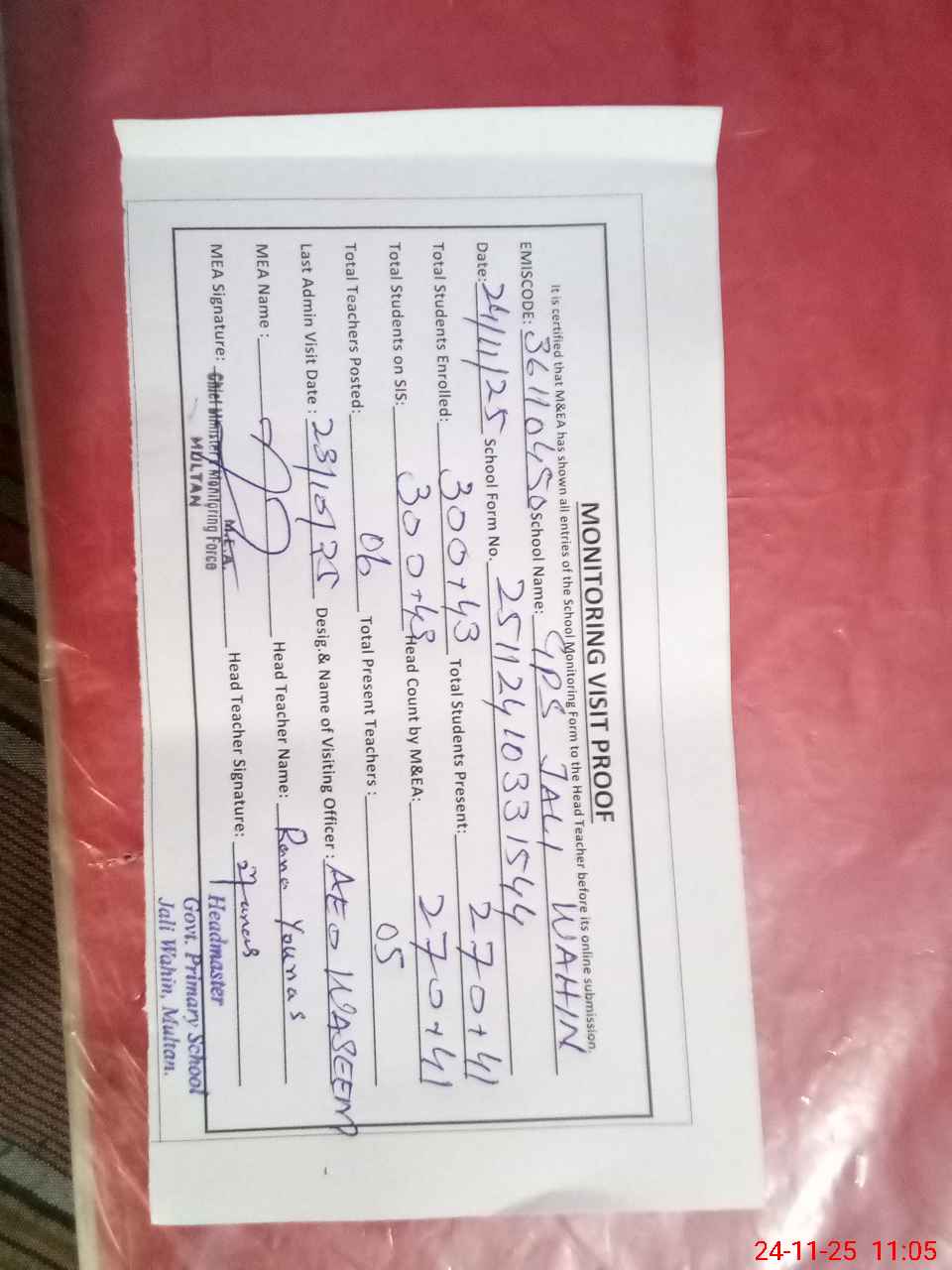 | Attendance Register | Head Teacher | MEA with School | Visit Proof |