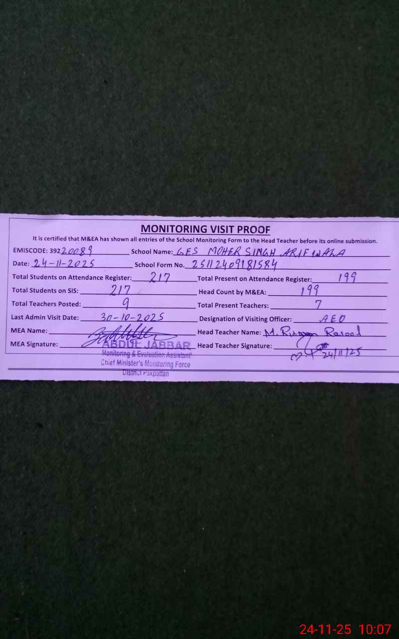 | EMIS Code: 39220089 | Name of School: GES MOHER SINGH ARIFWALA | |||