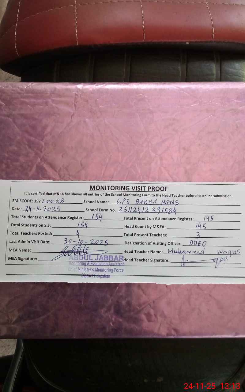 | EMIS Code: 39220088 | Name of School: GPS BAKHA HANS | |||