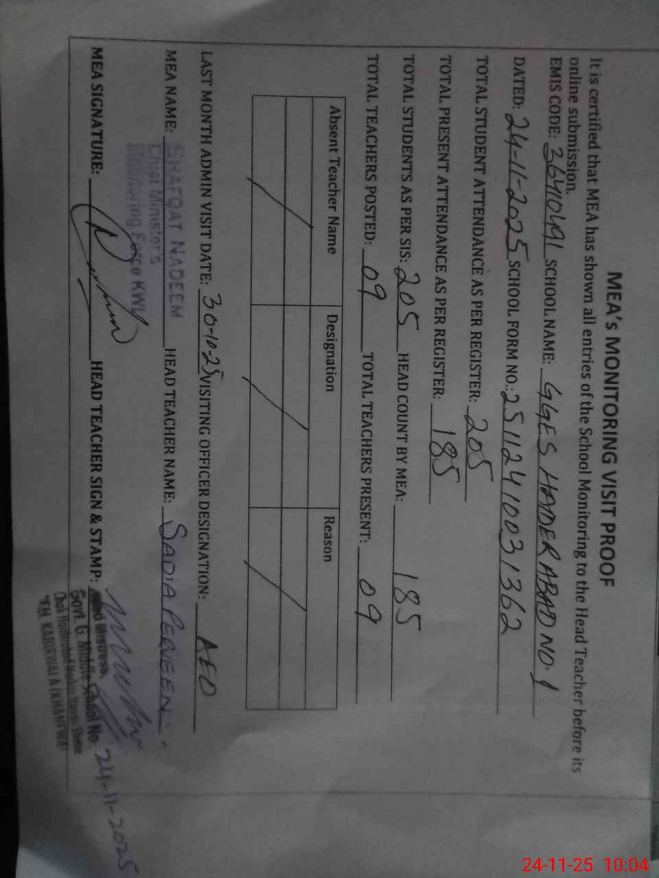 | Certified that this School was Inspected by the Undersigned MEA/DMO Today and the Information Stated Above is as Per Record. | |||||