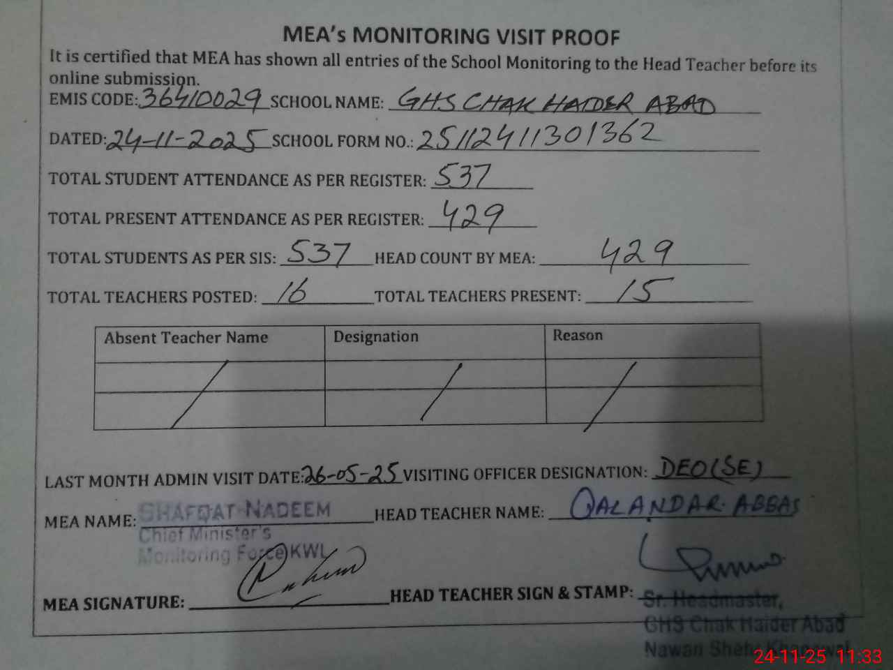| EMIS Code: 36410029 | Name of School: GHS CHAK HAIDER ABAD, NAWAN SHEHR | |||