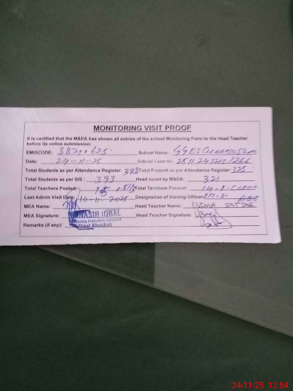 | Attendance Register | Head Teacher | MEA with School | Visit Proof |