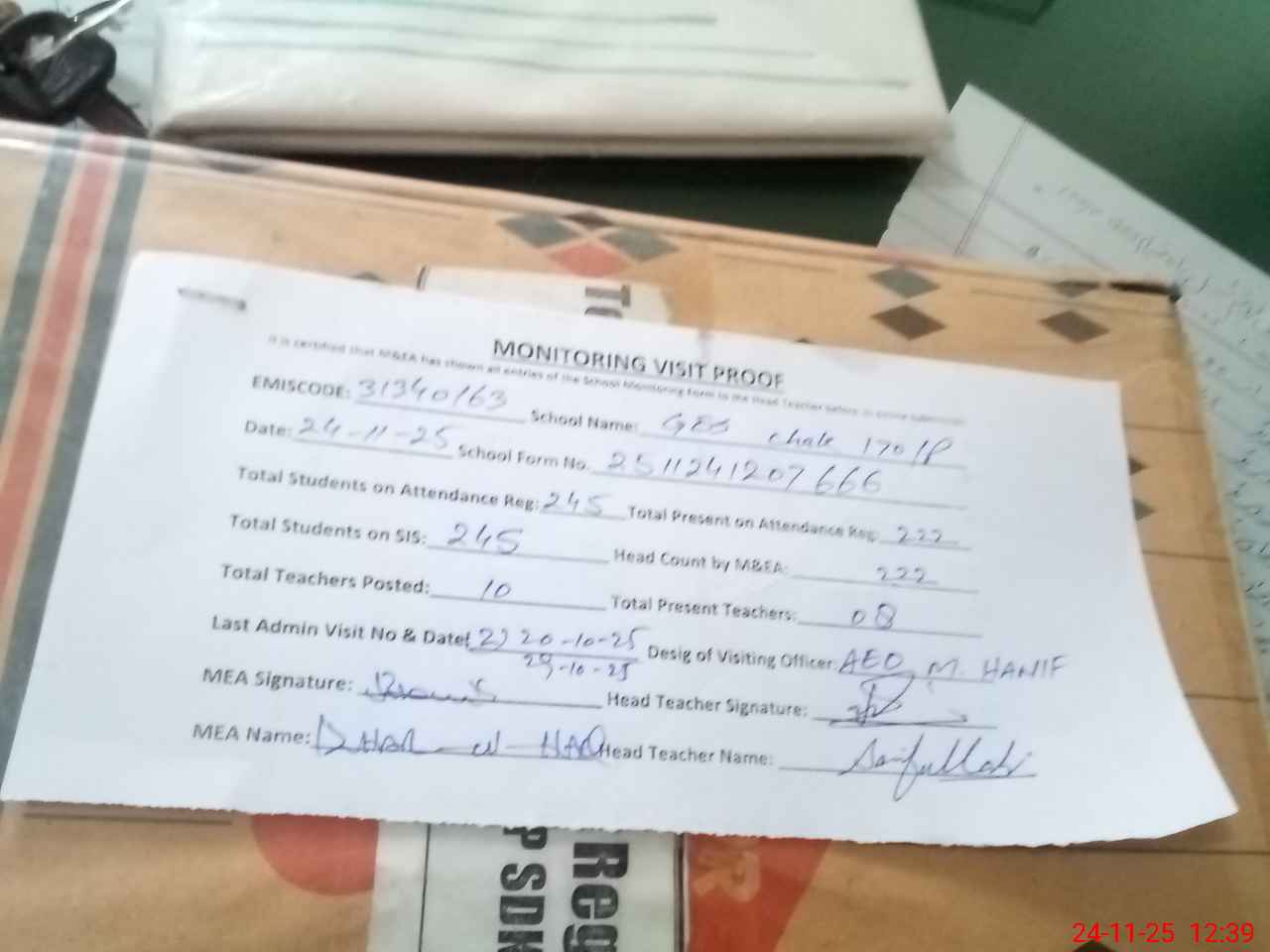 | Attendance Register | Head Teacher | MEA with School | Visit Proof |