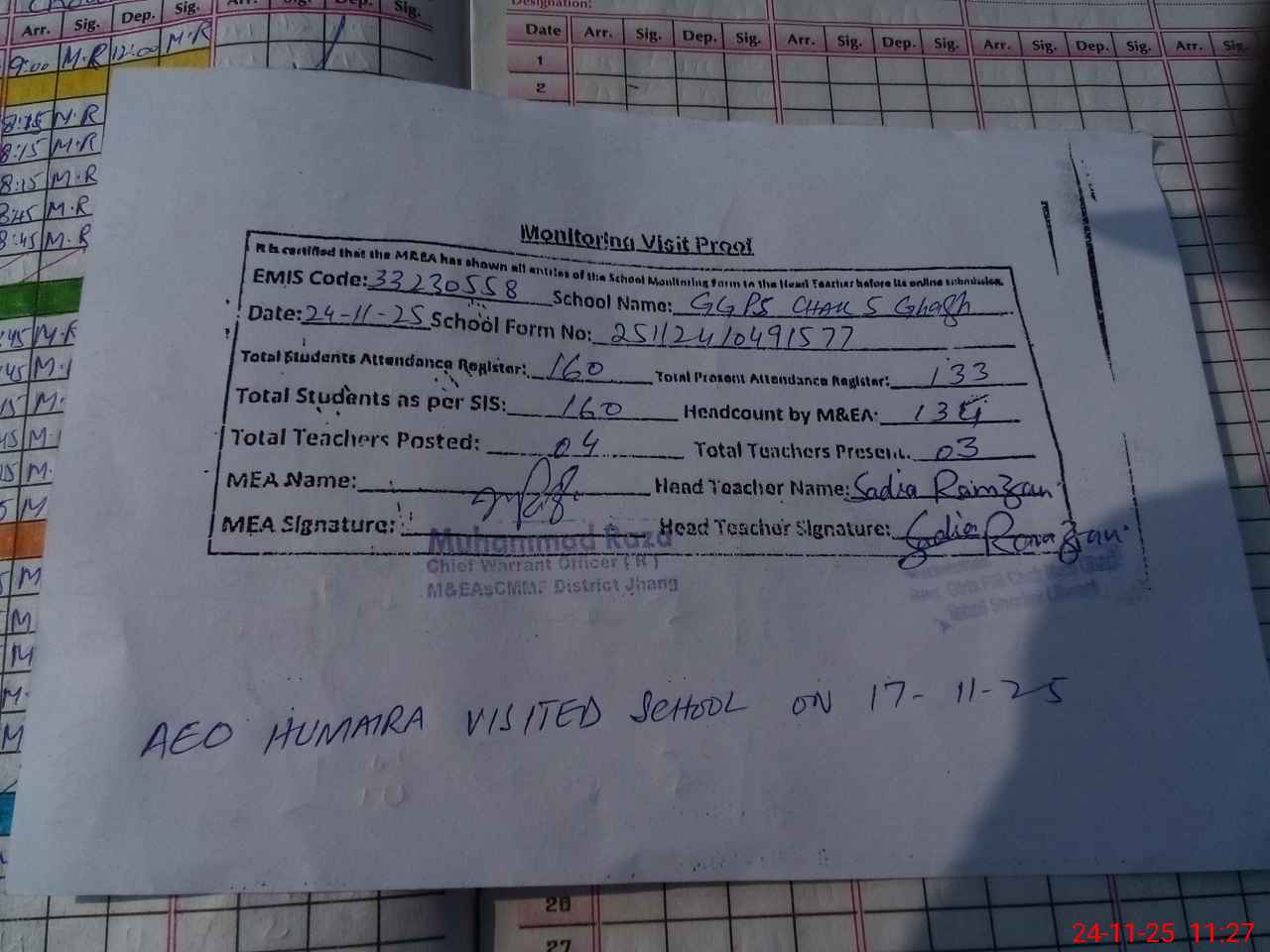 | Attendance Register | Head Teacher | MEA with School | Visit Proof |