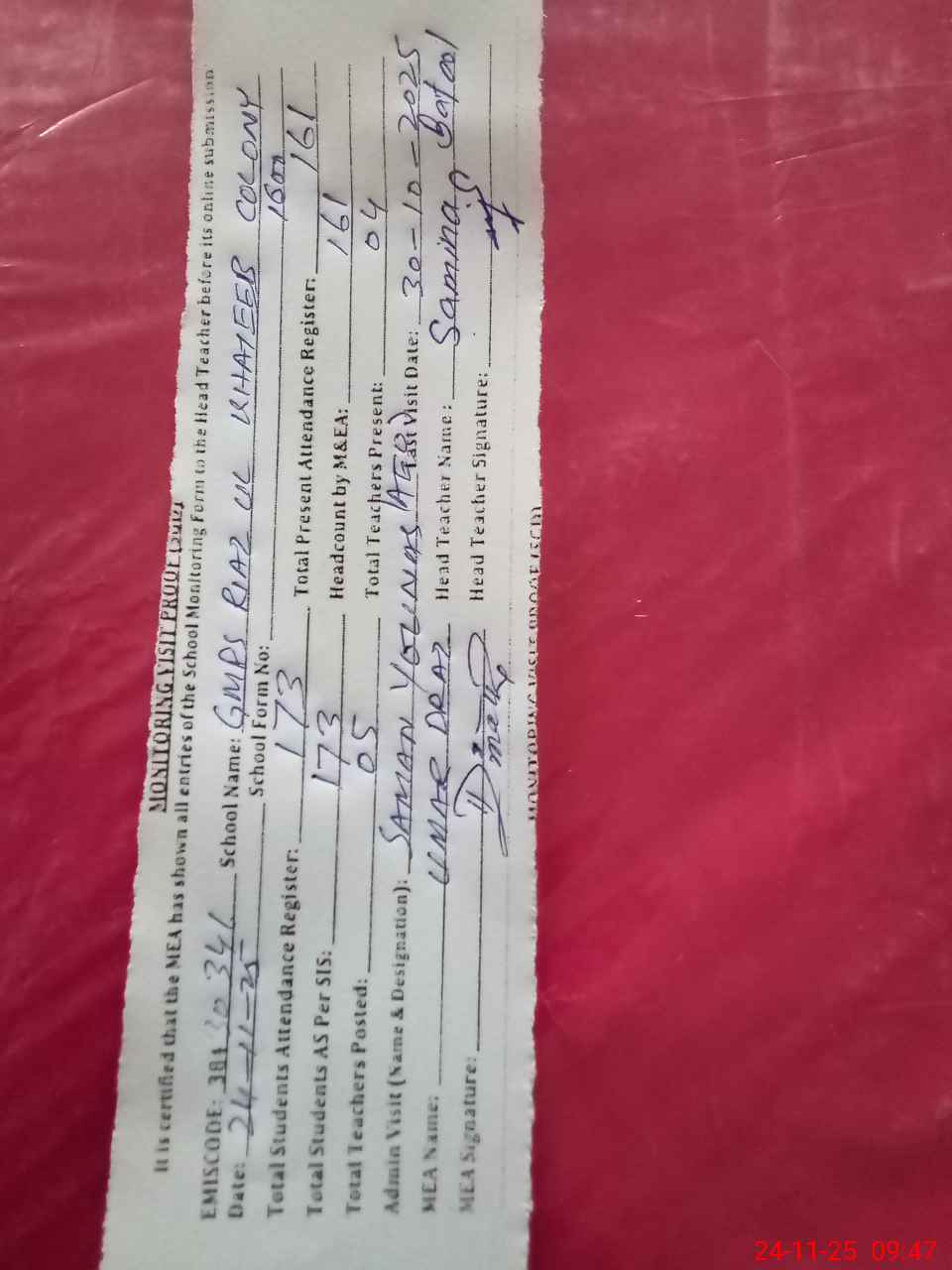 | Attendance Register | Head Teacher | MEA with School | Visit Proof |