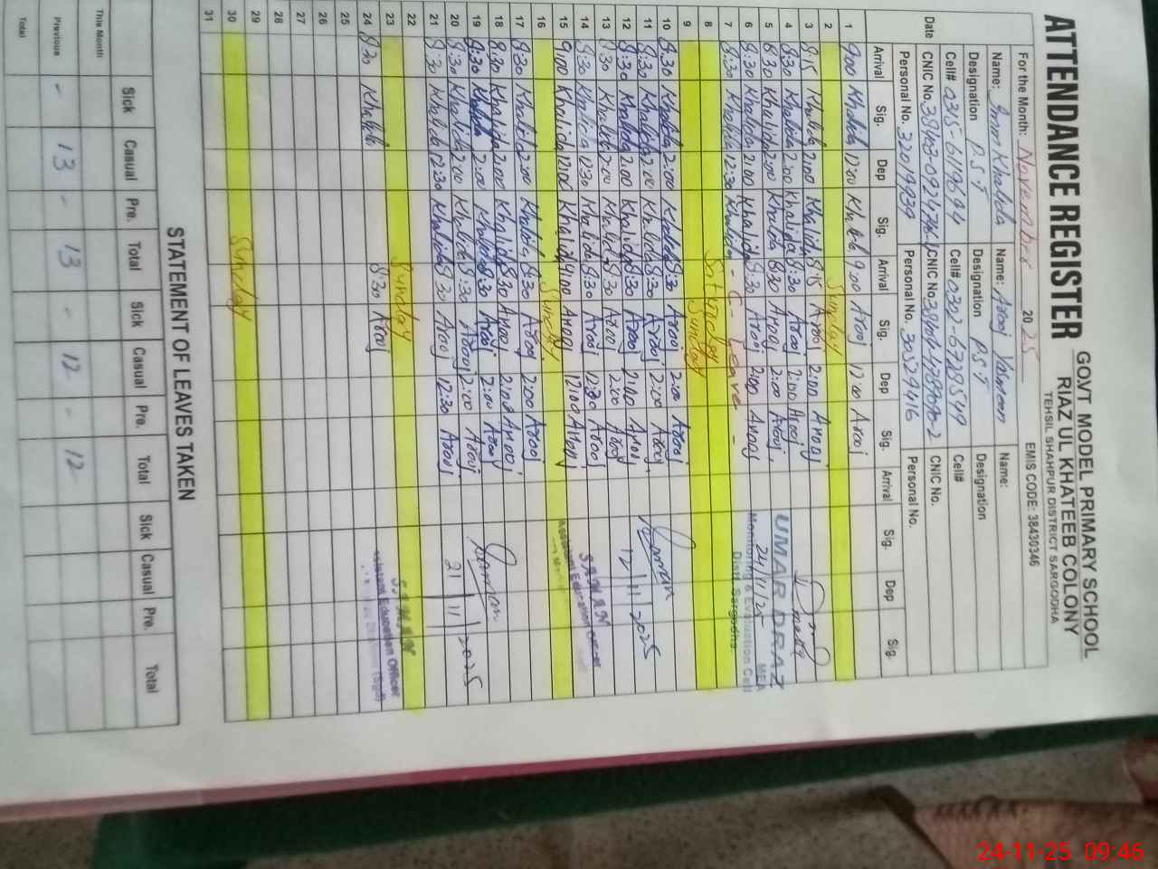 | CNIC | Full Name | Designation | R/C | Absence During Last Calender Month |