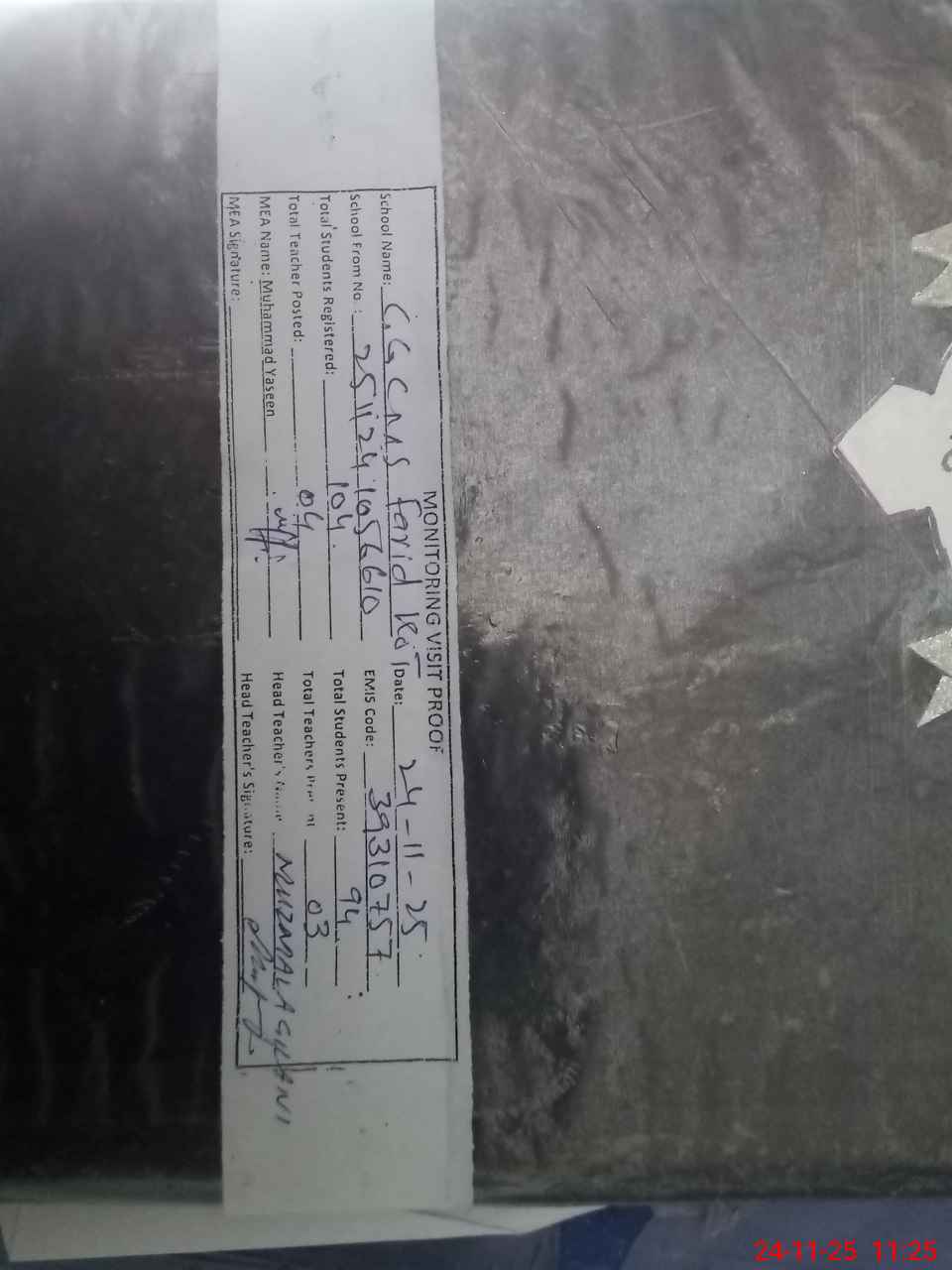 | Attendance Register | Head Teacher | MEA with School | Visit Proof |