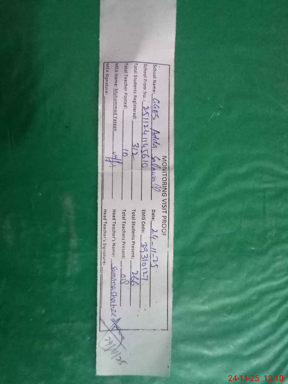 | Attendance Register | Head Teacher | MEA with School | Visit Proof |