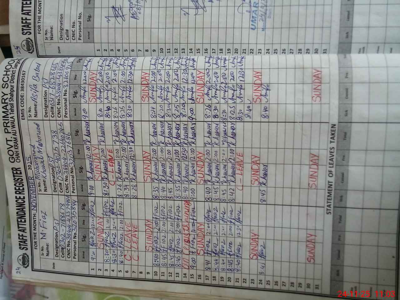 | CNIC | Full Name | Designation | R/C | Absence during last cal. month |
