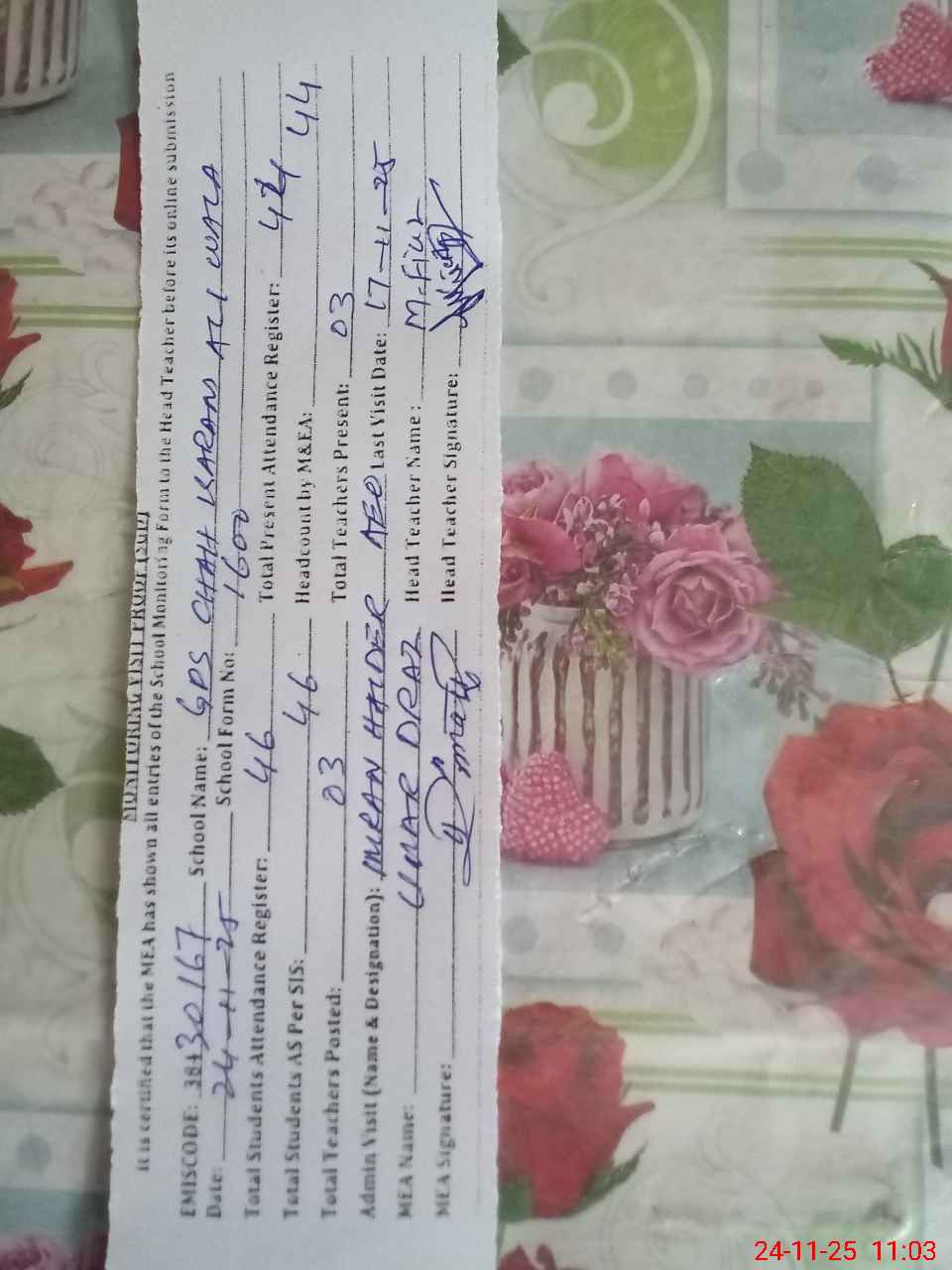 | Attendance Register | Head Teacher | MEA with School | Visit Proof |