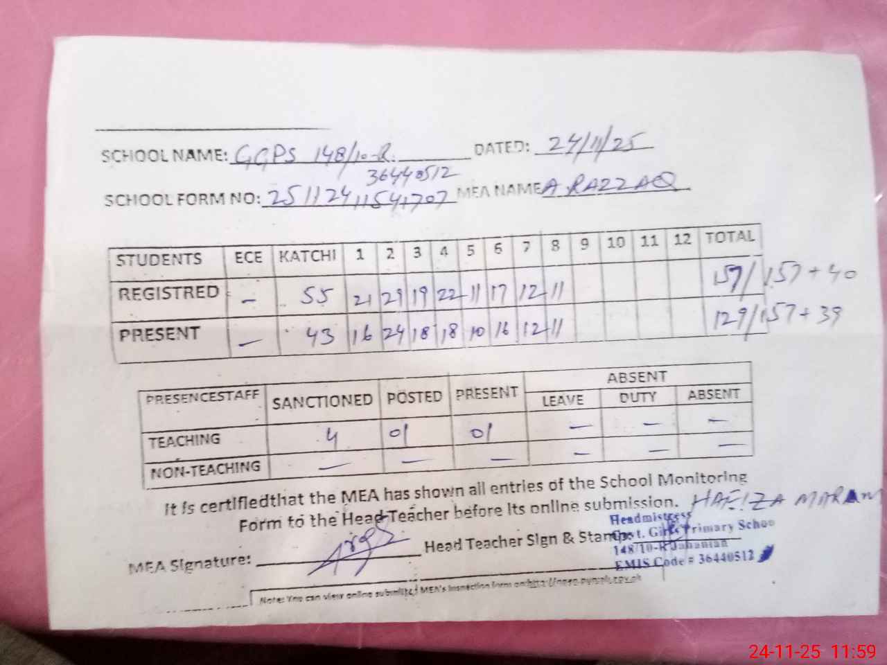 | Attendance Register | Head Teacher | MEA with School | Visit Proof |