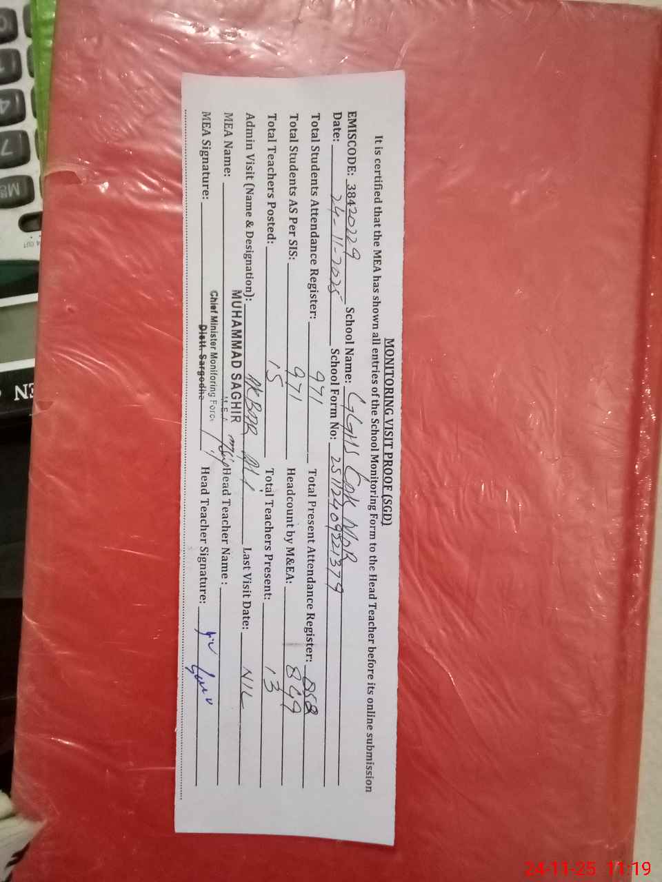 | Attendance Register | Head Teacher | MEA with School | Visit Proof |