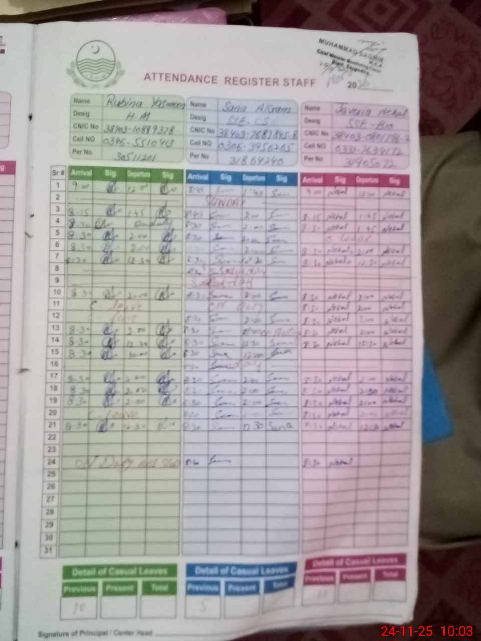 | CNIC | Full Name | Designation | R/C | Absence during last cal. month |