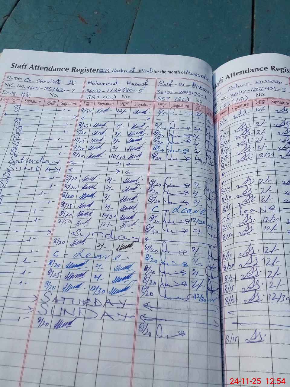 | CNIC | Full Name | Designation | R/C | Absence During Last Calender Month |