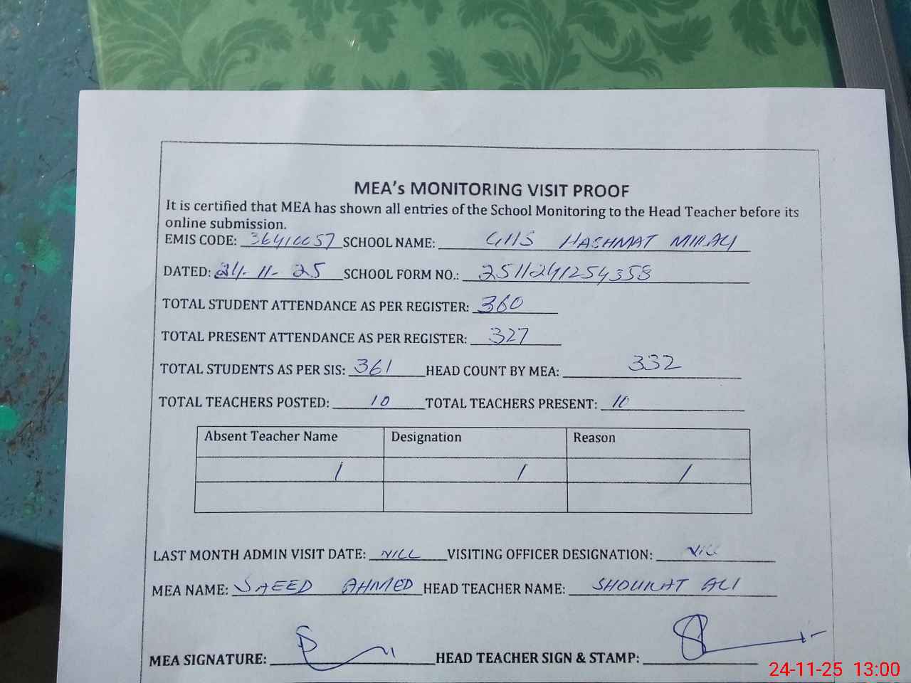 | Attendance Register | Head Teacher | MEA with School | Visit Proof |