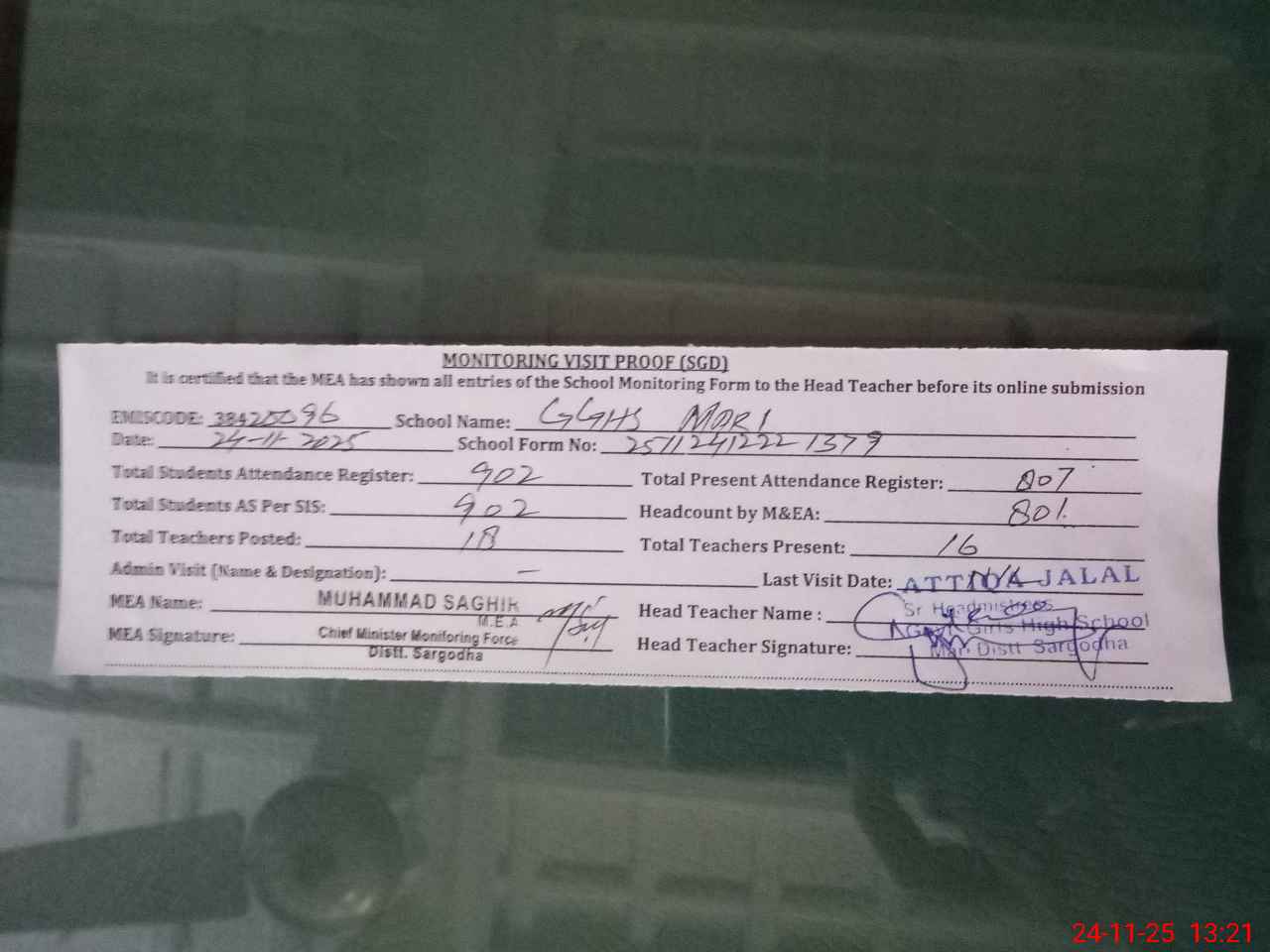 | Attendance Register | Head Teacher | MEA with School | Visit Proof |