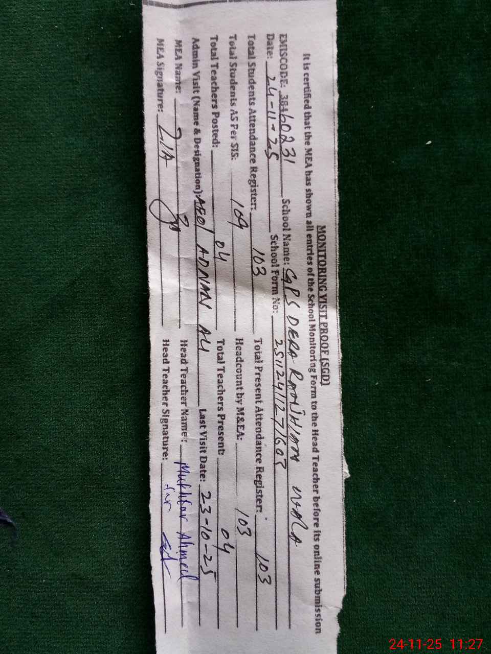 | Attendance Register | Head Teacher | MEA with School | Visit Proof |