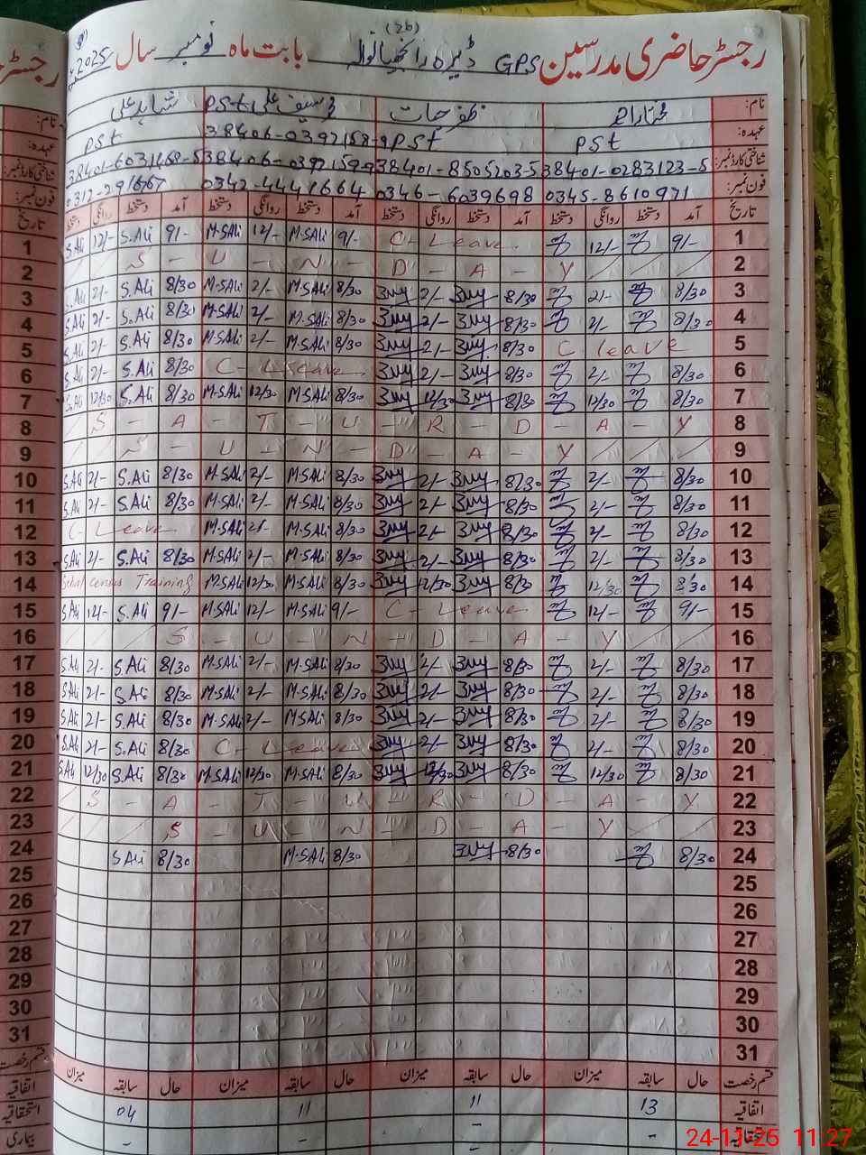 | CNIC | Full Name | Designation | R/C | Absence During Last Calender Month |