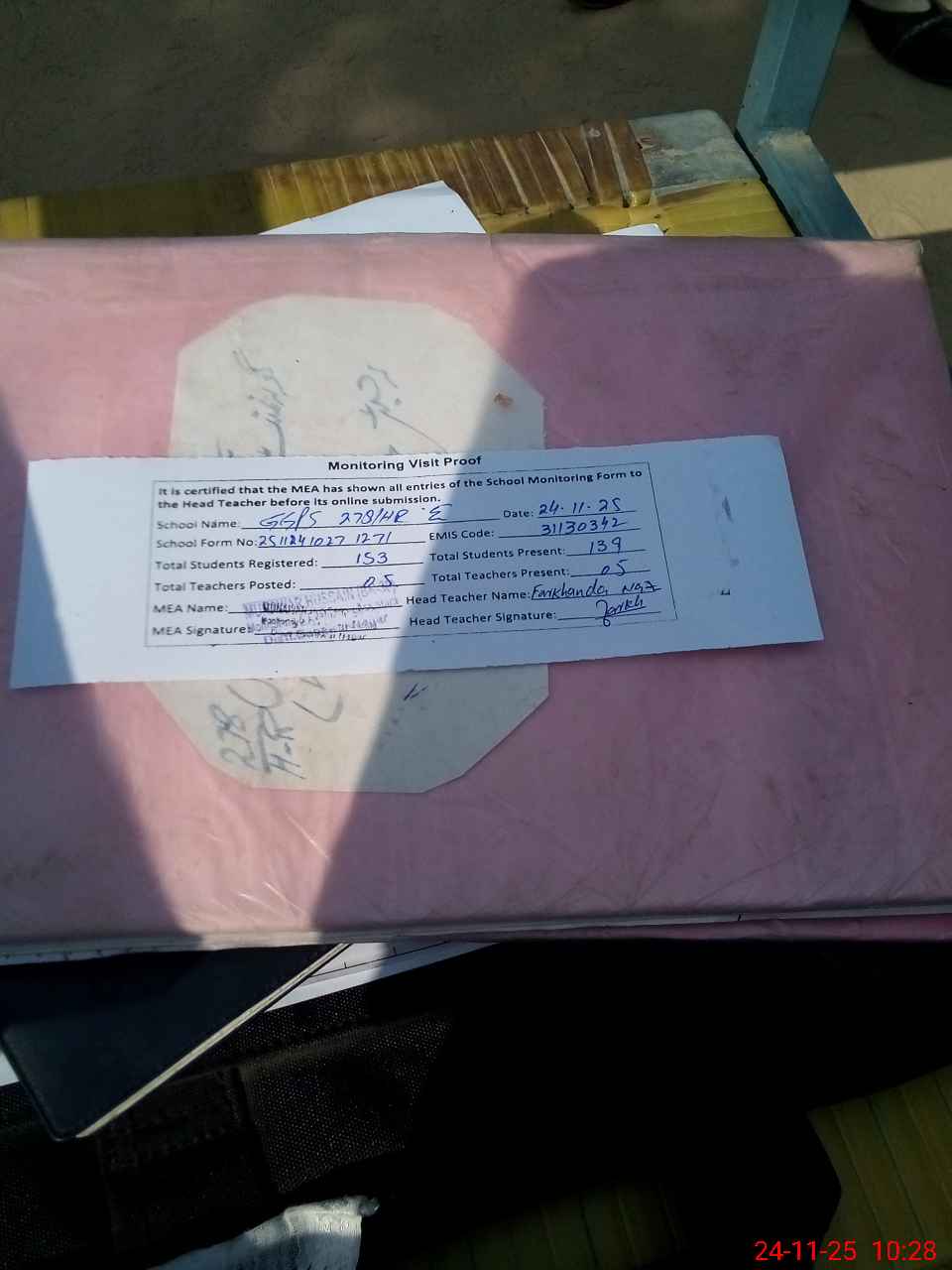 | Attendance Register | Head Teacher | MEA with School | Visit Proof |