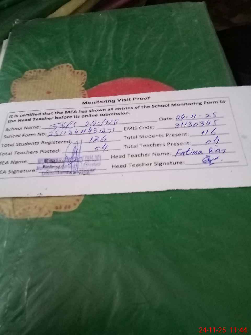 | Attendance Register | Head Teacher | MEA with School | Visit Proof |
