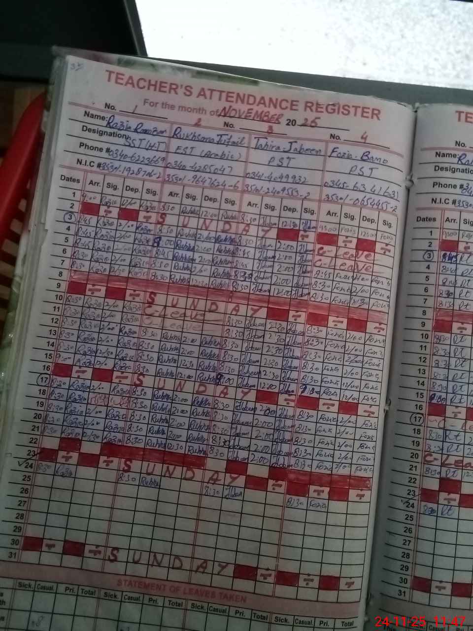 | CNIC | Full Name | Designation | R/C | Absence During Last Calender Month |