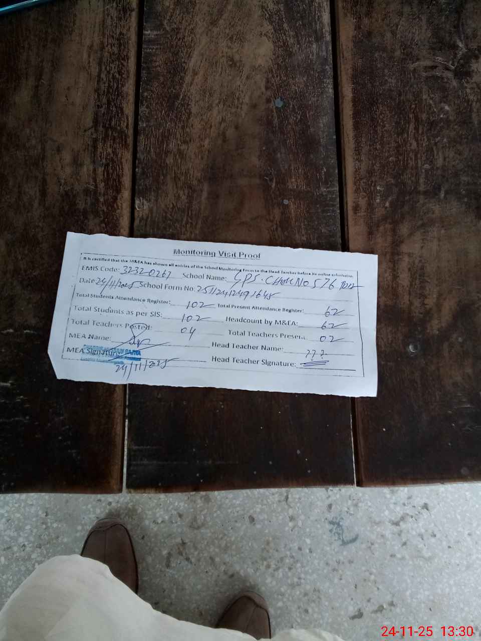 | Attendance Register | Head Teacher | MEA with School | Visit Proof |