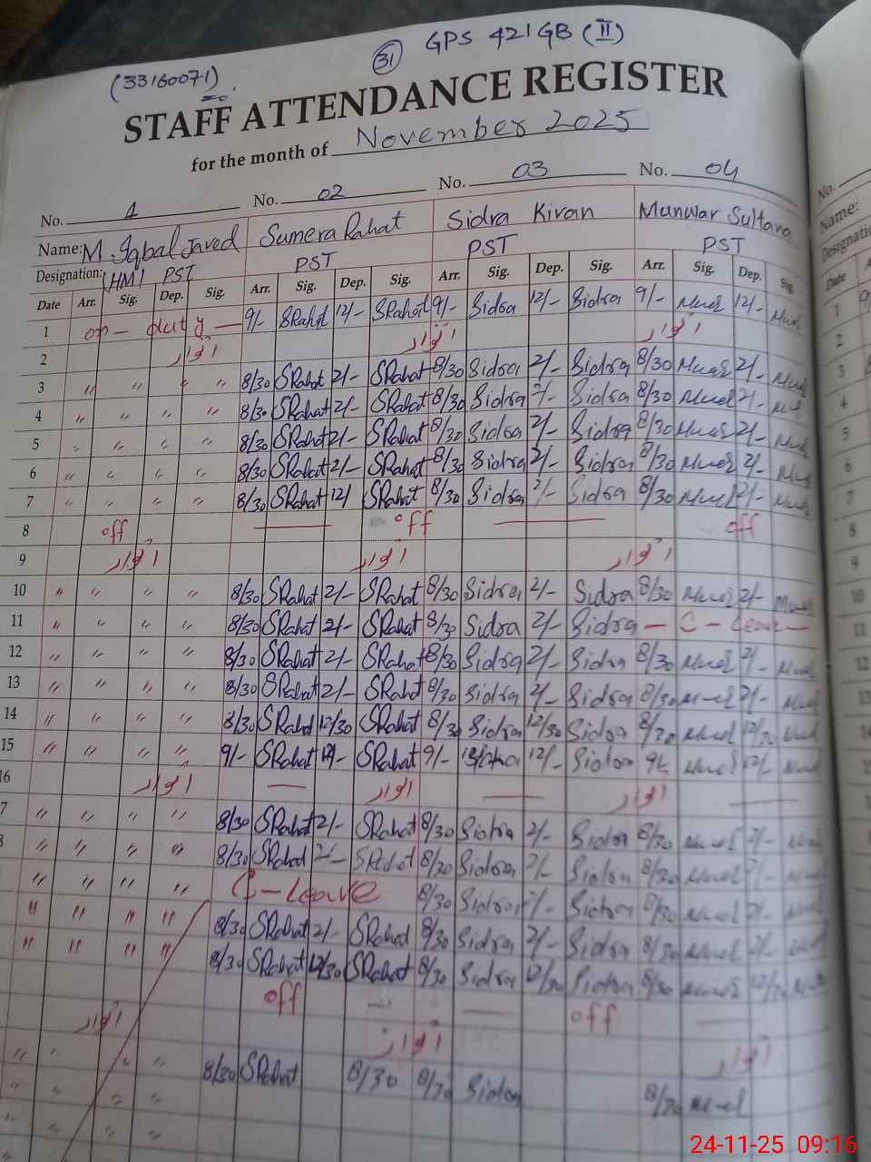 | CNIC | Full Name | Designation | R/C | Absence During Last Calender Month |